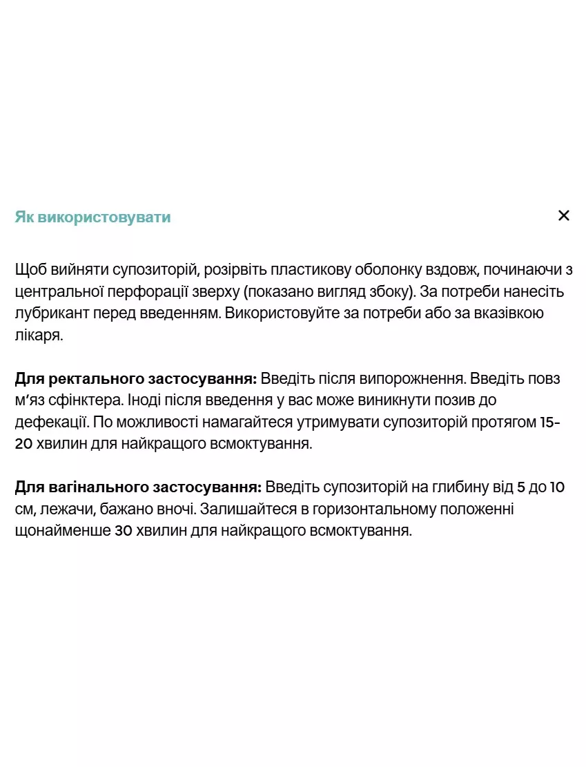 Вводити після дефекації. Іноді після введення у вас може виникнути позов до евакуації. По можливості постарайтеся потримати 15-20 хвилин для кращого всмоктування супозиторію.