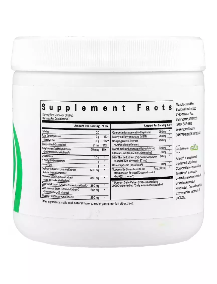 Optimal GI Plus от Seeking Health содержит мощную смесь чистых питательных веществ для поддержания здоровья пищеварительной системы и желудочно-кишечного тракта с добавлением L-глютамина для дополнительной поддержки слизистой оболочки желудочно-кишечного тракта.