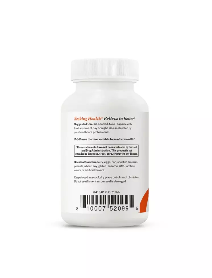 P-5-P от Seeking Health содержит 25 мг сильнодействующего витамина Б6 (1471% дневной нормы) в активной форме P-5-P (пиридоксаль-5'-фосфат).