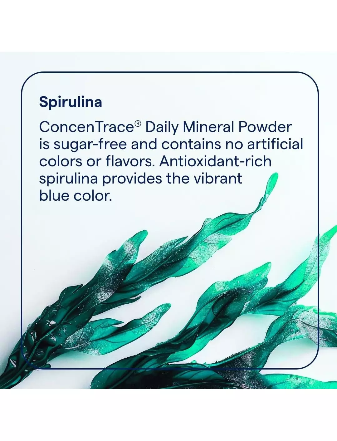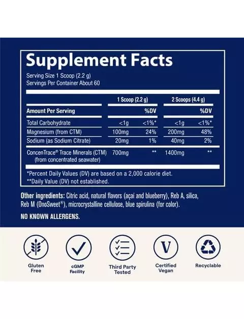 Щоденний мінеральний порошок ConcenTrace® містить повний спектр природних мікроелементів, яких може не вистачати у вашому раціоні, у смачній щоденній суміші для напоїв. Ці мінерали підтримують оптимальну енергію, спокійний настрій, здоровий метаболізм, функцію нервів і м'язів, а також загальне самопочуття. Дрібка блакитної спіруліни, багатої на антиоксиданти, забезпечує яскравий блакитний колір.