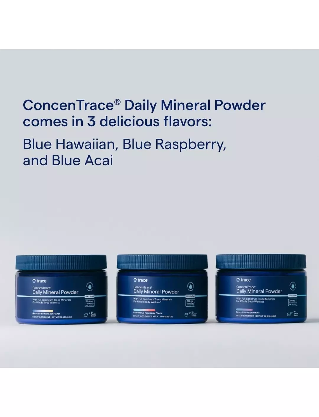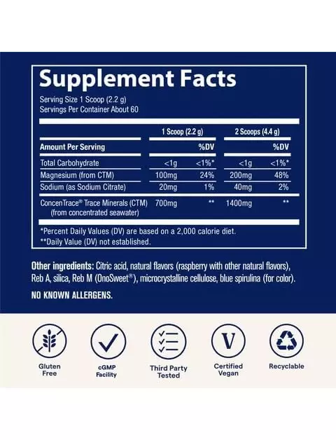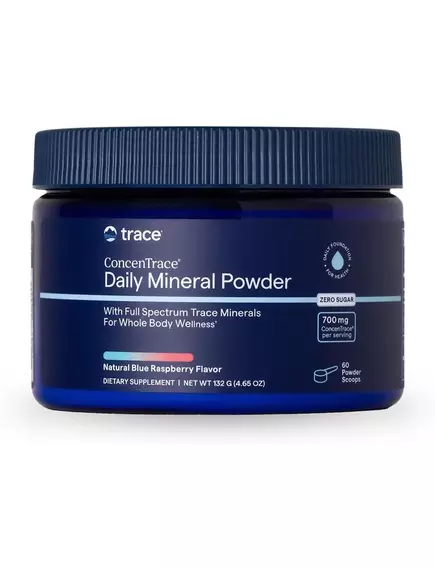 Щоденний мінеральний порошок ConcenTrace® містить повний спектр природних мікроелементів, яких може не вистачати у вашому раціоні, у смачній щоденній суміші для напоїв. Ці мінерали підтримують оптимальну енергію, спокійний настрій, здоровий метаболізм, функцію нервів і м'язів, а також загальне самопочуття. Дрібка блакитної спіруліни, багатої на антиоксиданти, забезпечує яскравий блакитний колір.