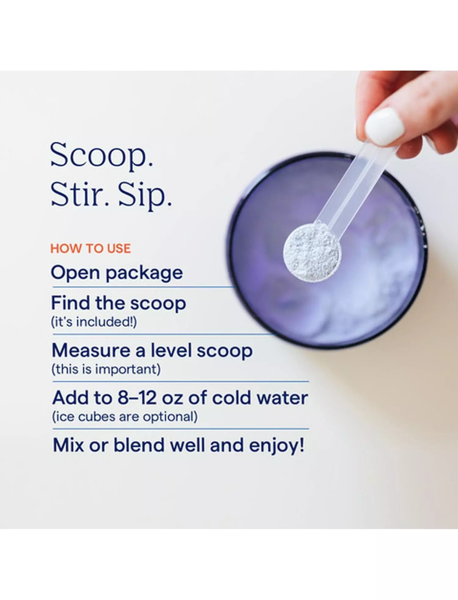Додайте 1 мірну ложку до 240-350 мл води або 2 мірні ложки до 470-690 мл води.