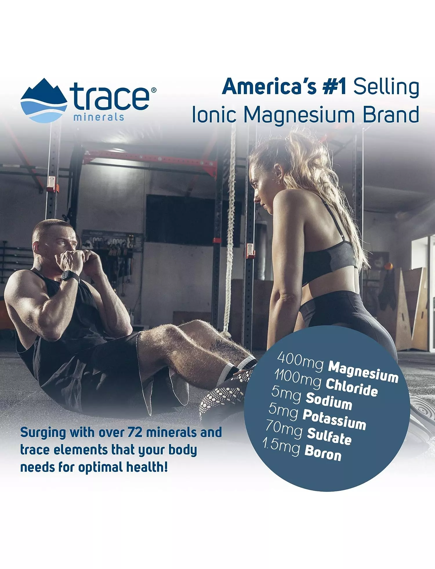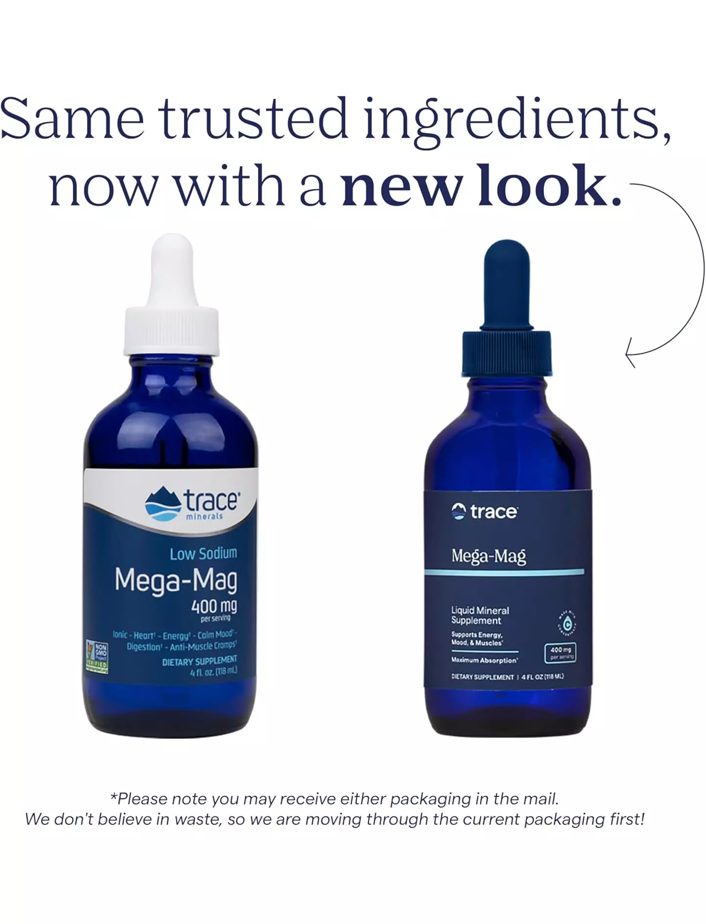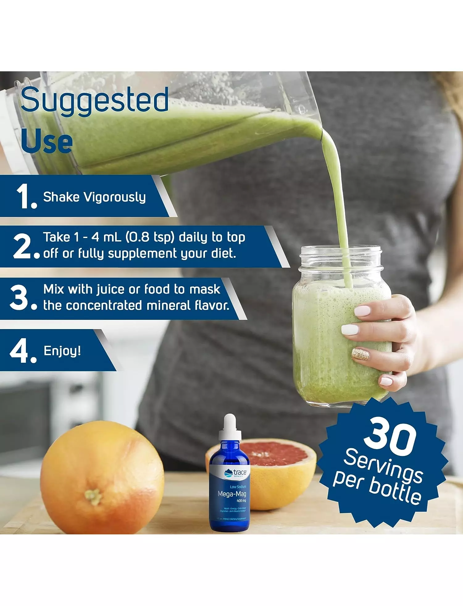 Trace Minerals Mega-Mag – это 400 мг на порцию высокоэффективного, богатого, натурального, биодоступного концентрированного источника жидкого хлорида магния с полным спектром ионных микроэлементов, которые действуют как естественные сопутствующие факторы в формуле с низким содержанием натрия.