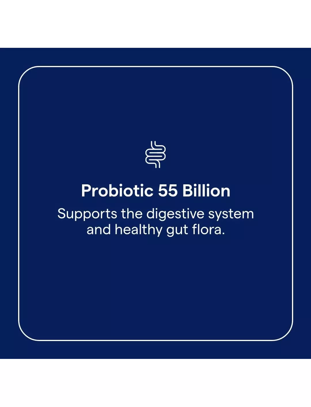 Пробіотик 55 мільярдів КУО містить 10 штамів життєздатних мікроорганізмів, включаючи 11 мільярдів колонієутворюючих одиниць біфідобактерій і 44 мільярди колонієутворюючих одиниць лактобацил, бактерій, які найчастіше зустрічаються в товстому та тонкому кишечнику. Оскільки з віком кишкова мікрофлора часто знижується, прийом пробіотиків може допомогти вашому організму підтримувати здоров'я травної системи.