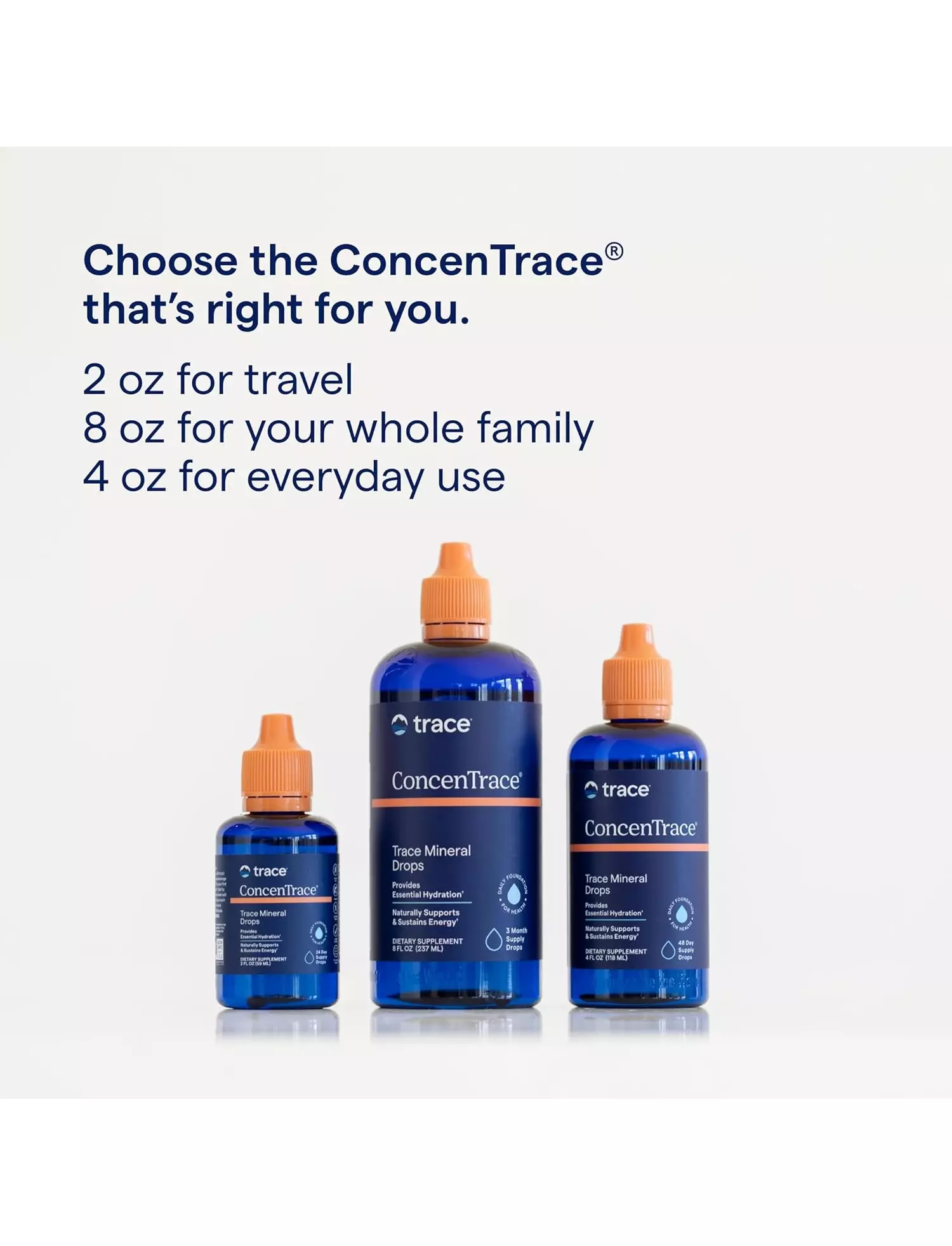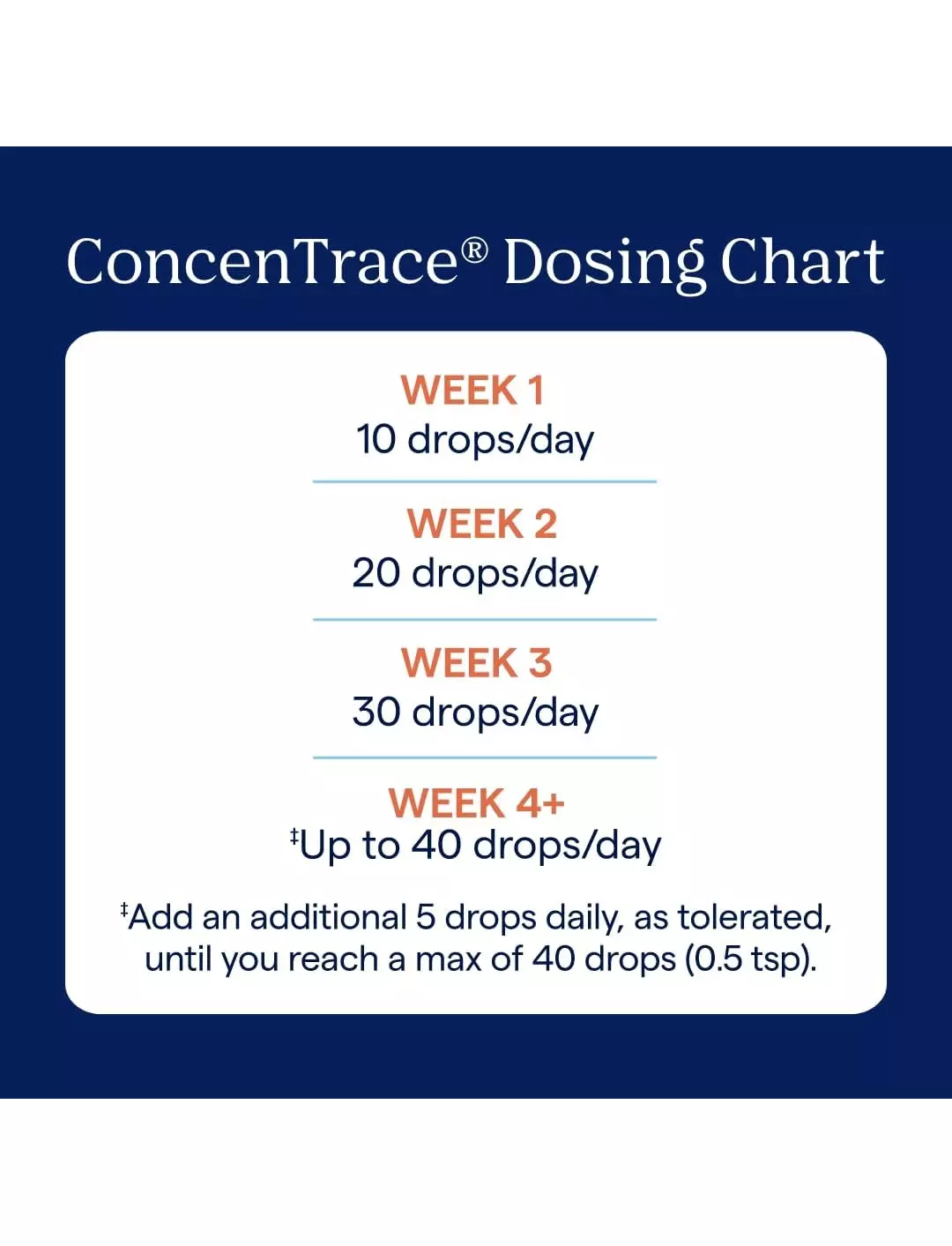 На відміну від інших добавок, які ви приймаєте лише тоді, коли вам це необхідно (наприклад, вітамін С під час сезону грипу), ConcenTrace® призначений для щоденного прийому. Оскільки ми втрачаємо мікроелементи в результаті простих повсякденних дій, дуже важливо щодня поповнювати ці необхідні мінерали. Створення щоденного ритуалу, наприклад додавання наших крапель у ранкову склянку апельсинового соку або додавання 5 крапель у кожну склянку води, яку ви п'єте вдень, допомагає створити здорову звичку та оздоровити ваше тіло.