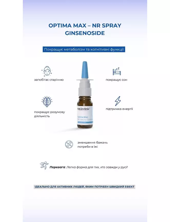 Optima Max NR+ Neuro Optimiser — це інноваційна система доставки назального спрею, що містить суміш гінзенозиду Rg3 та нікотинаміду рибозиду, а також компоненти, що сприяють солюбілізації та дисперсії. Optima Max NR+ Neuro Optimiser використовується як харчова добавка для підтримки неврологічного та когнітивного здоров'я.