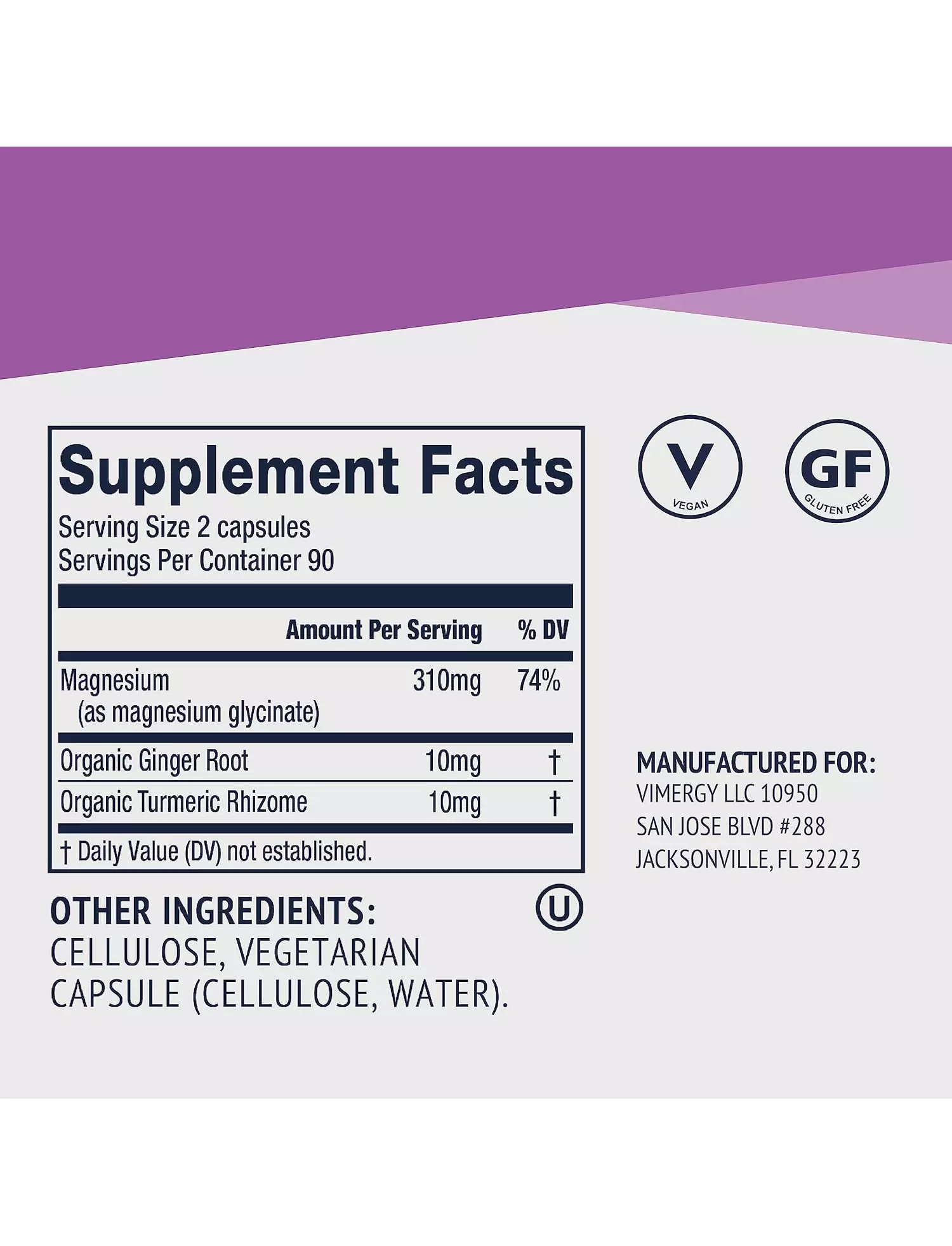 Гліцинат магнію Vimergy — це «розумний магній», який імітує той, що міститься в натуральних продуктах харчування, а також збагачений порошком імбиру та кореня куркуми. Зніміть стрес, отримайте користь для серцево-судинної системи та багато іншого з потужною щоденною порцією магнію.