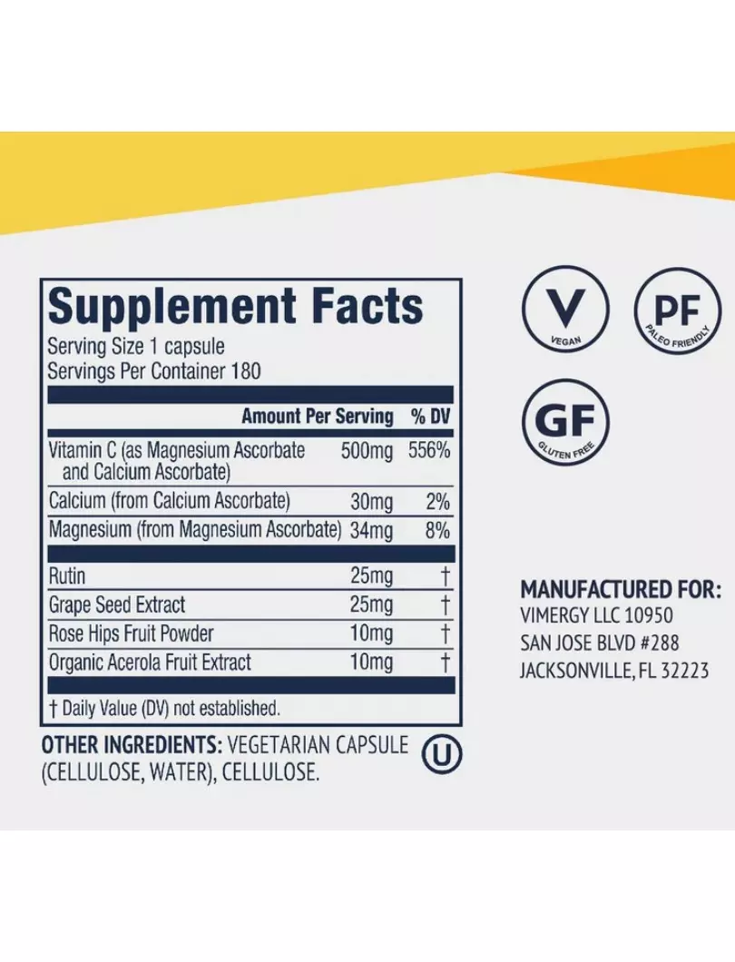 капсули Vimergy Micro-C також містять допоміжні рослинні компоненти, такі як екстракт ацероли, екстракт виноградних кісточок та шипшини, а також біофлавоноїд рутин. Кожна капсула Vimergy Micro-C містить 500 мг буферизованого вітаміну C.Сприяє здоров'ю імунітету: